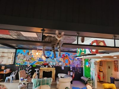 The cafe works with local rescues only. They do not take in feral or household cats. However, Kim is happy to connect owners looking to rehome their cats with her local rescue organization contacts.