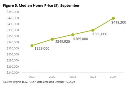 Virginia’s competitive market conditions are also reflected in the rising median home sales price, it added. The median price in September was $419,200, a 10.3% jump from a year ago. This is a gain of more than $39,000 to the median price, the largest dollar jump in the statewide median price since the spring of 2022.