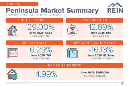 According to REIN data, the number of homes closed during June was up slightly from May, and up 6.3% when compared to June 2024. The MSP of homes sold — the selling price of the home in the very middle of the pack — reached its highest point ever for the Peninsula at $365,000. That represents a 5% increase from the same month last year.