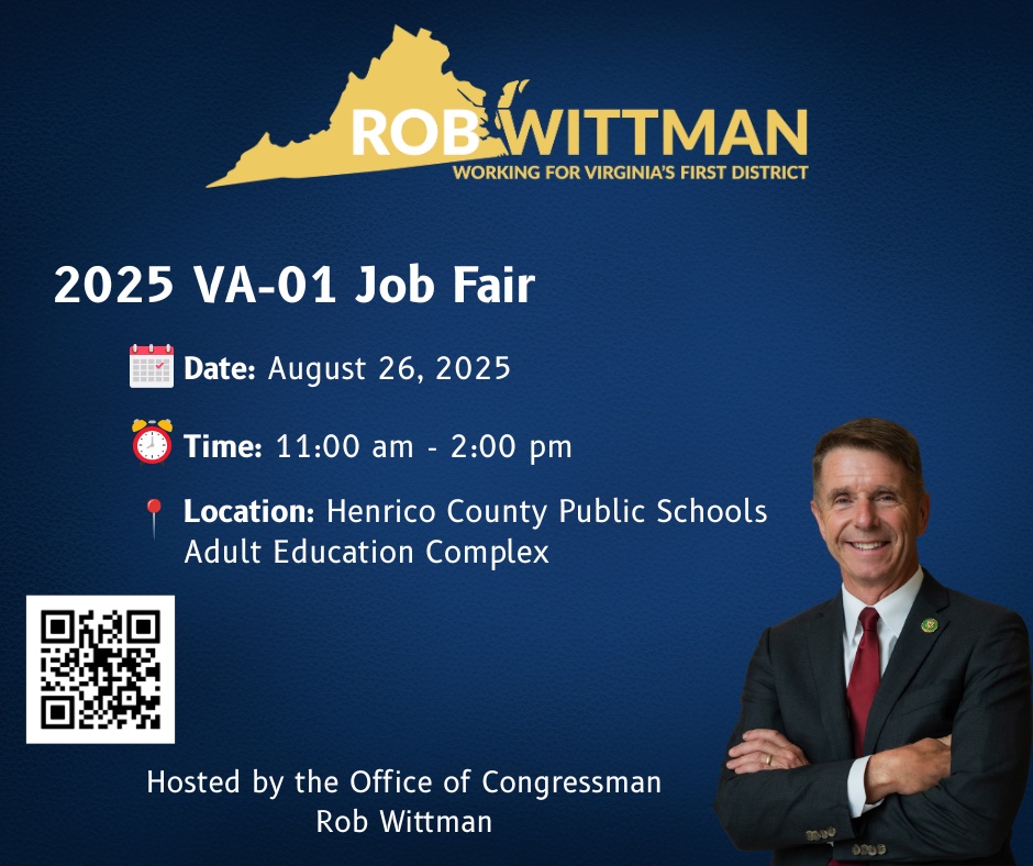 Rep. Rob Wittman’s office is hosting a job fair Tuesday, Aug. 26 at the Henrico Public Schools Adult Education Complex from 11 am to 2 p.m.