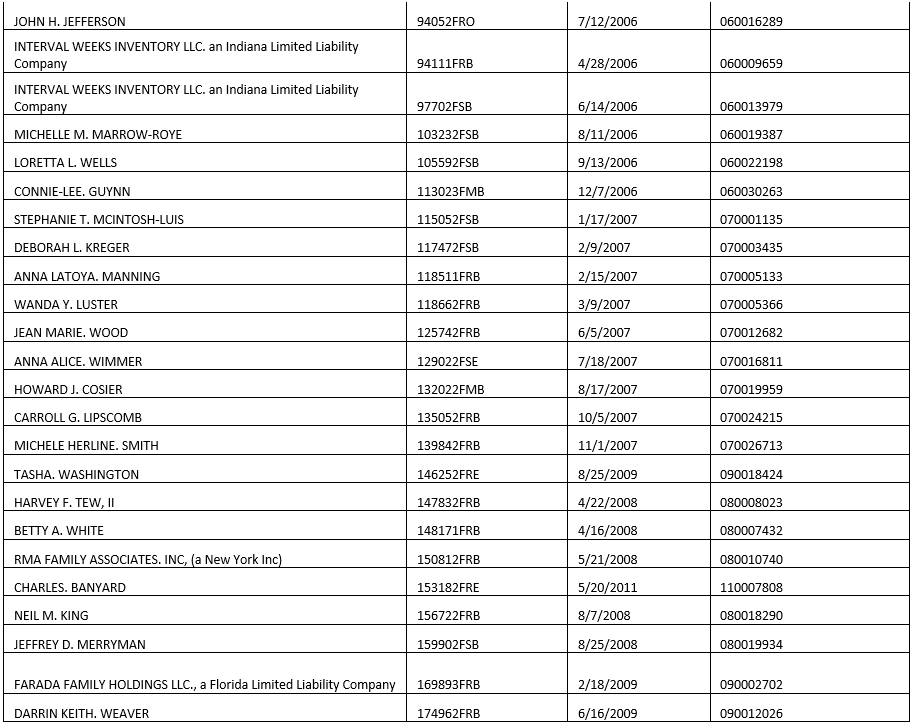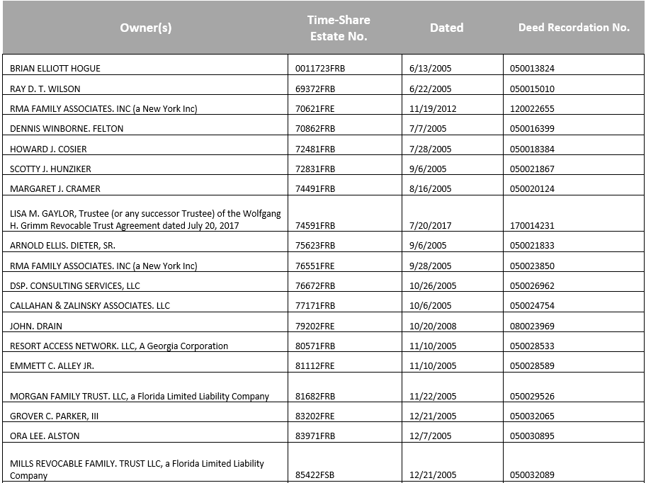 Pursuant to that certain Appointment of Trustee duly recorded in the Clerk’s Office for the Circuit Court for the County of York, Virginia (the Clerk’s Office), default having occurred under the OWNER OBLIGATIONS of each of the owners shown below as required in the Time-Share Documents by reason of failure to pay maintenance fees and notice of default having been given to each of the owners specifying the amount thereof and payment not having been made, the undersigned will offer for sale at public auction at the Front Entrance of the Circuit Courthouse Building at 300 Ballard Street, Yorktown, Virginia 23690 on DECEMBER 6, 2022, at 11:00am. the Time-Share Estates listed below, located at Colonial Crossings of Williamsburg, a Vacation Ownership Resort located at 200 English Garden Way, York County (Williamsburg), Virginia 23188.