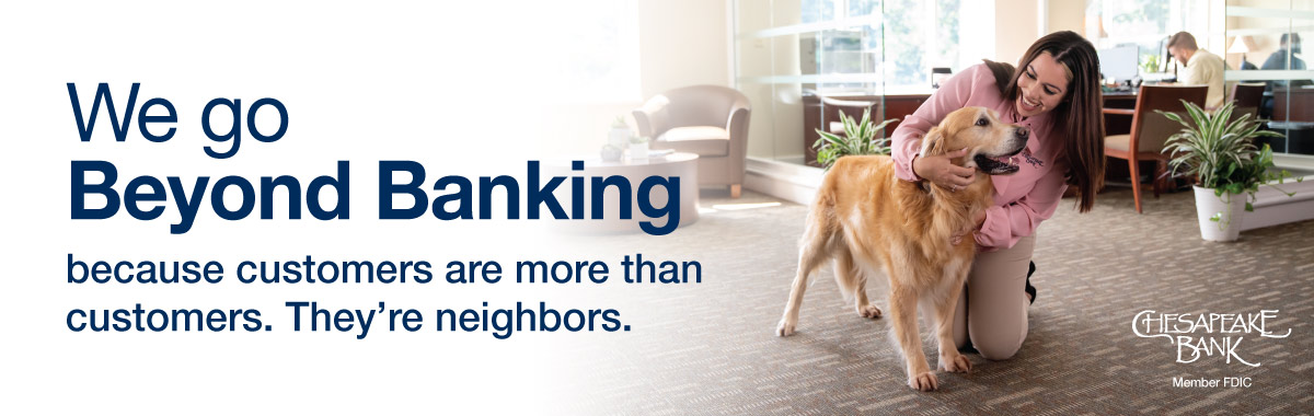 Though most days, going beyond banking simply means being a live and reachable support team who will answer the phone when called to give same day service. Not just for the customer who lives down the street but for the local business who relies on Chesapeake Bank as their credit card processor and needs immediate help to resolve an issue. Beyond banking means helping to achieve goals and solve problems.