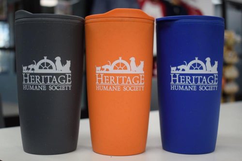 Just in time for pipping hot holiday drinks, Heritage Humane Society-logoed, reusable tumblers are just in. The 20 oz., double-walled construction insulates hot or cold liquids. Complete with a snap-on lid with spill-resistant thumb slide, the cup is available in orange, blue, or gray.