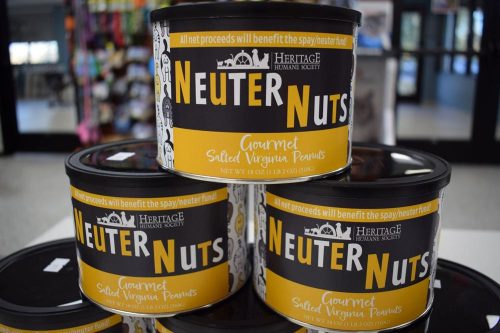 One of the ReTAIL Store’s biggest sellers is the new Neuter Nuts. A witty collaboration with Virginia Diner, 18 oz. tins of Neuter Nuts are gourmet salted Virginia peanuts. All proceeds benefit The Heritage Humane Society Spay and Neuter Fund. Considering that in just seven years, a single pair of cats and their offspring could produce a staggering total of 420,000 kittens, the sales of Neuter Nuts benefit animal and community welfare throughout Greater Williamsburg.