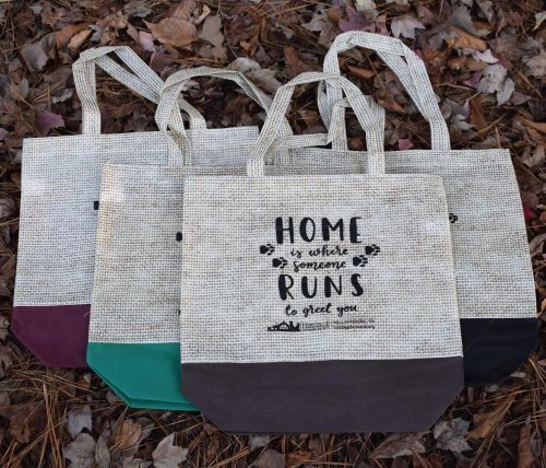 Shoppers looking for a reusable tote for their purchases – or even to use as a gift bag for a fellow animal lover — can select from four different color options. Made of water-resistant material, the front sports, “Home is where someone runs to greet you.” For purchases of $25 or more, shoppers will receive a tote for free.