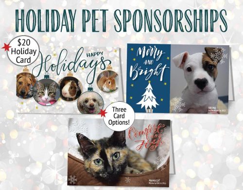 Holiday sponsorship cards are a way to gift someone with the joy of providing care in their name for shelter pets. Available in three new designs featuring shelter pets, this gift starts at $20 with the donation going towards the care costs such as food or health needs shelters pets. With almost 300 dogs, cats, and more at the shelter hoping for a forever home, these donations can be life changing for both the adopter and adoptee. Sponsorship cards can be purchased in person or online. Each can be personalized for the recipient or in honor of or memory of a family pet.