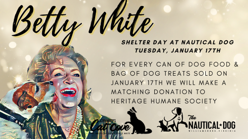 The pet professionals of Nautical Dog- Pet Market & Dog Wash and Schwartzy’s Cat Cove are joining The Heritage Humane Society in supporting the Betty White Challenge. For every can of dog or cat food and every bag of dog or cat treats purchased at the store on Jan. 17, they are making a matching donation to The Heritage Humane Society. To learn more, visit the dedicated Facebook event page.