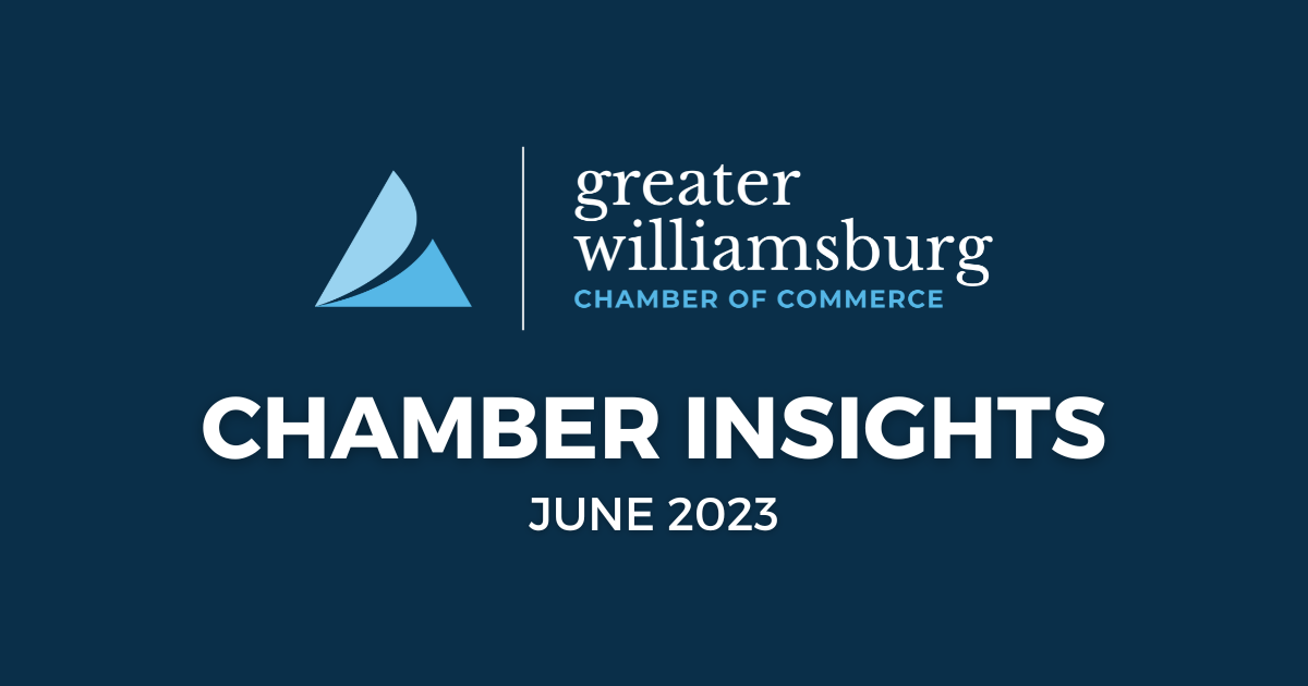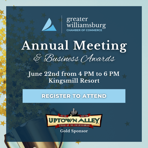Up next, the Chamber invites its members and the community to attend the 2023 Annual Meeting & Business Awards, to be held on Thursday, June 22nd from 4 to 6 PM at Kingsmill Resort. In addition to celebrating the past year and passing the gavel to the incoming Board Chair, the event will recognize the Small Business of the Year, Early Stage Business of the Year, Home-Based Business of the Year, and more. The event is sponsored by Uptown Alley, and you may register online to attend.