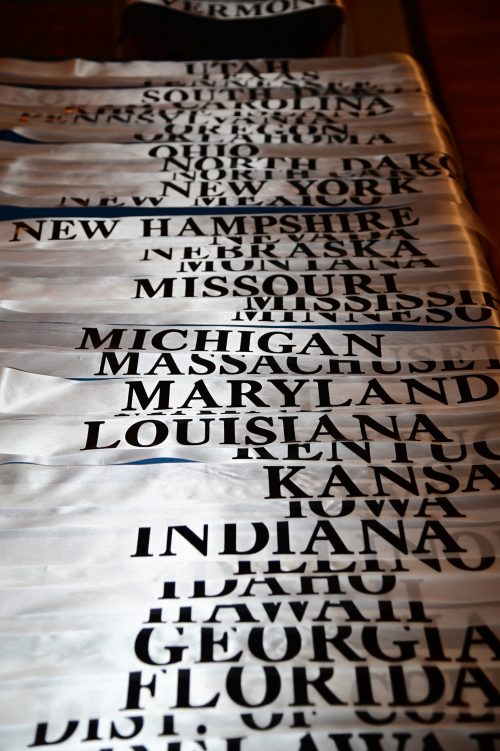 The event is invite-only, although anyone can request an invitation as space allows. Participants can pre-purchase a state to represent before the event or take a chance to receive a state at the door. People have been known to show up several hours prior to the start to get a state sash.