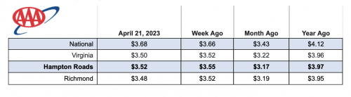 Locally, the gas price average for the commonwealth decreased to $3.50, two cents lower than a week ago and 28 cents higher than a month ago. In Hampton Roads, prices decreased three cents to $3.52, 35 cents higher than last month and 45 cents lower than a year ago.