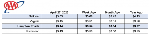 Locally, the gas price average for the commonwealth decreased to $3.45 — is six cents lower than a week ago and 14 cents higher than a month ago. In Hampton Roads, prices decreased 10 cents to $3.44, 10 cents higher than last month and 53 cents lower than a year ago.