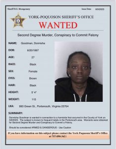 Donnisha Goodman is wanted in connection to the homicide, according to YPSO. Warrants have been obtained for second degree murder and conspiracy to commit a felony. Goodman is known to frequent hotels in the Portsmouth area, officials said, and warned that the suspect should be considered armed and dangerous.