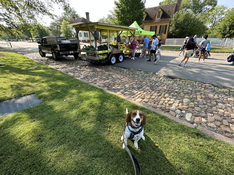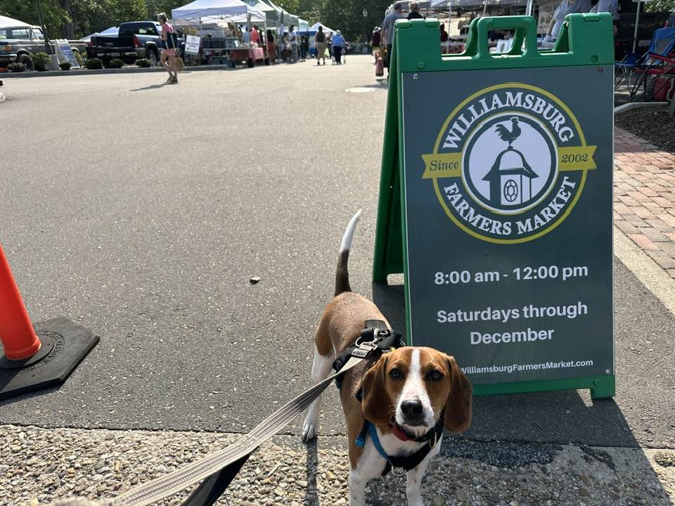Saturday mornings in the summer months mean a trip to your local farmers market. Ferris and his human love to visit Williamsburg Farmers Market held every Saturday between March and October in Colonial Williamsburg’s Merchant Square. (Seasonal holiday markets occur in November and December.)