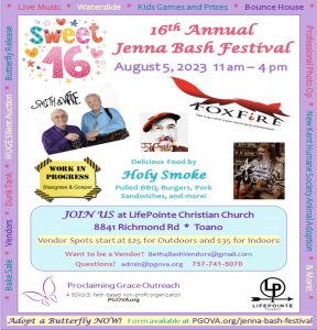 The carnival-style family event takes place Aug. 5 at the LifePointe Christian Church in Toano from 11 a.m. until 4 p.m. Jenna Bash will include games, inflatables, a waterslide for the kids, vendors, live music, a silent auction and more, with proceeds benefitting the operations and the Building Fund of Proclaiming Grace Outreach.