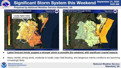 “It is looking increasingly likely that a significant storm system will impact the region Friday into this weekend. Threats include heavy rainfall of 1-4 inches (highest towards the coast), strong wind gusts of 40-60 mph (again highest along the coast), and moderate to locally major coastal flooding. Impacts will be greatest adjacent to the water. Please keep apprised to the latest forecast on weather.gov/akq over the next day or so,” the National Weather Service in Wakefield warned on its Facebook page.