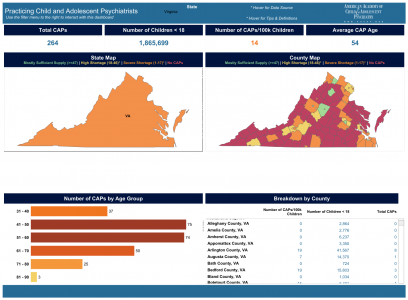 There are 264 child and adolescent psychiatrists in Virginia, according to the American Academy of Child and Adolescent Psychiatry. That equates to 14 psychiatrists for every 100,000 children, the national average, and falls within the range of a “severe shortage.” There are many counties without a child psychiatrist.