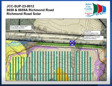 The staff report presented to the Board of Supervisors states that “while not a typical primary use, staff finds this use could be appropriate in Rural Lands as solar farms in general are low intensity uses (traffic, noise, etc.) after the initial construction phase, and could be temporary in nature and return to agricultural or forestal use at the conclusion of the lease term/decommissioning. The majority of the land has been cleared for farming, is surrounded by natural wooded growth, and the applicant will provide enhanced buffering along Richmond Road.”