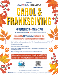 This Giving Tuesday, Nov. 28, the Peninsula SPCA will be hosting a special event with C&F Enterprises, Carol & Franksgiving, at 819 Bluecrab Road in Newport News from 11 a.m.-2 p.m.