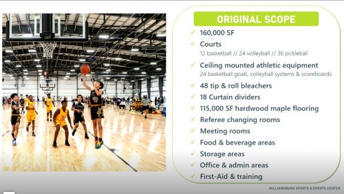 The proposed 200,000-square-foot state-of-the-art facility would be located across from the current Williamsburg Visitor Center and include basketball, volleyball and pickleball courts, a climbing rock wall, “ninja gym” and conversion turf system. The complex would also incorporate meeting space and food and beverage areas.