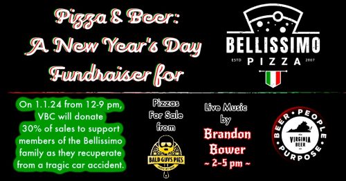 The VBC taproom will be open from noon until 9 p.m. on Monday, Jan. 1, with the brewery donating 30% of sales that day to Bellissimo Pizza. Bald Guys Pies will also be participating by donating 10% of sales.
