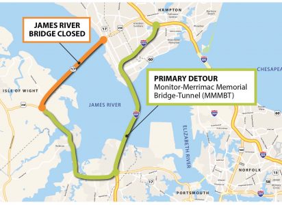 Vehicular Traffic: The JRB will be closed to all vehicular traffic in both directions for up to four continuous days during each closure. During the full closures, all traffic will be detoured to the I-664 Monitor-Merrimac Memorial Bridge-Tunnel (MMMBT) as one of the primary alternate travel routes. Additional alternate routes include the Jamestown-Scotland Ferry and Route 460.