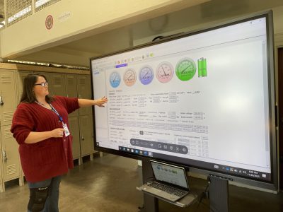 “Being able to have these representations of a real solar panel and wind turbine to show [students] this is what they look like, how they work and this is how we could use it is phenomenal.” Cornelison continued, “We have a program on our classroom computer that we use every day to monitor how much power is produced. It can tell you ‘this can charge so many AA batteries or this would power up the lights of the Eiffel Tower for so many hours.'”