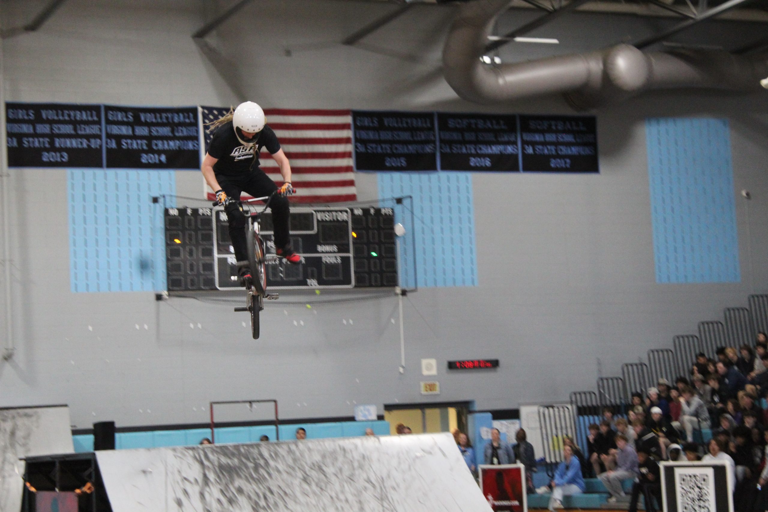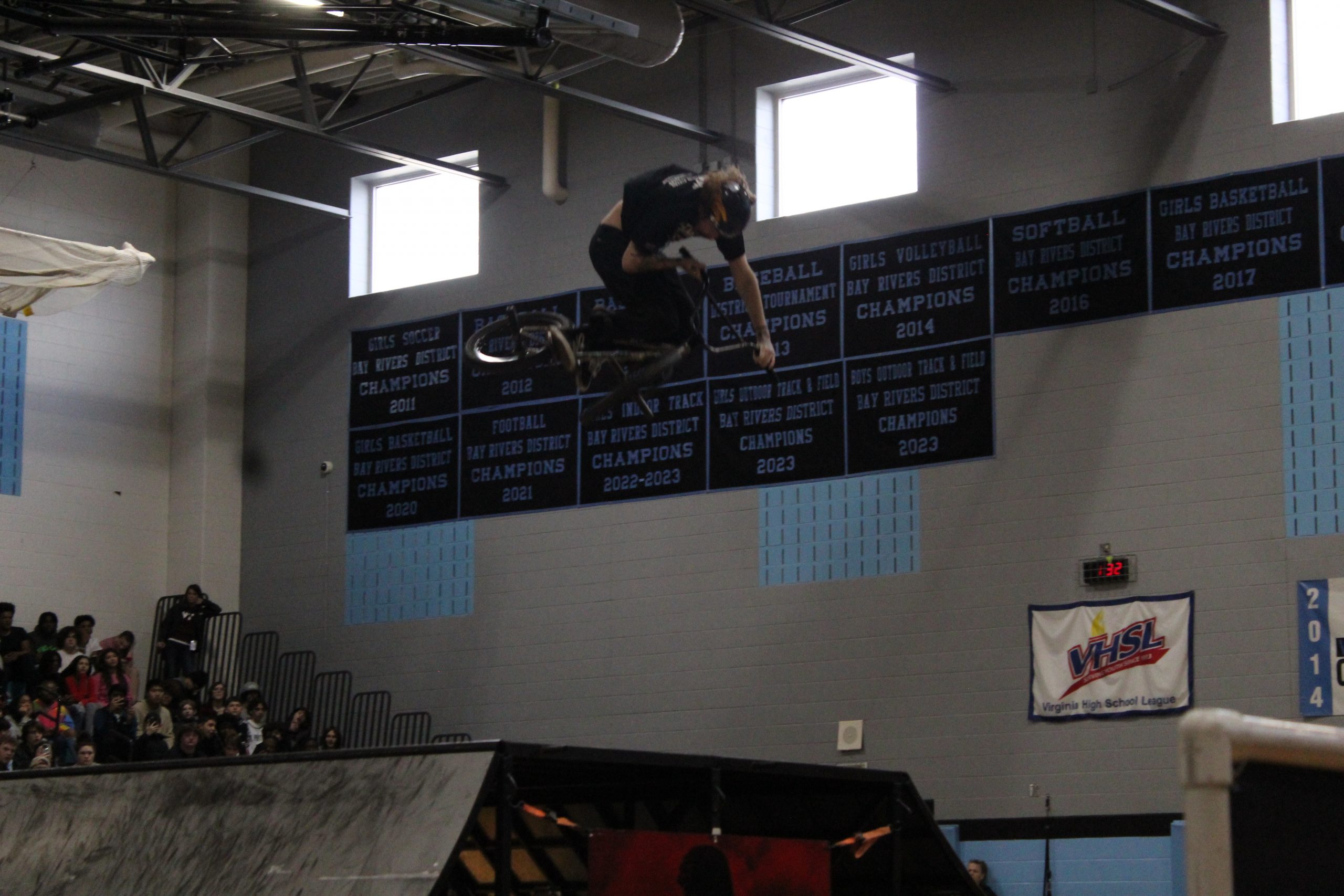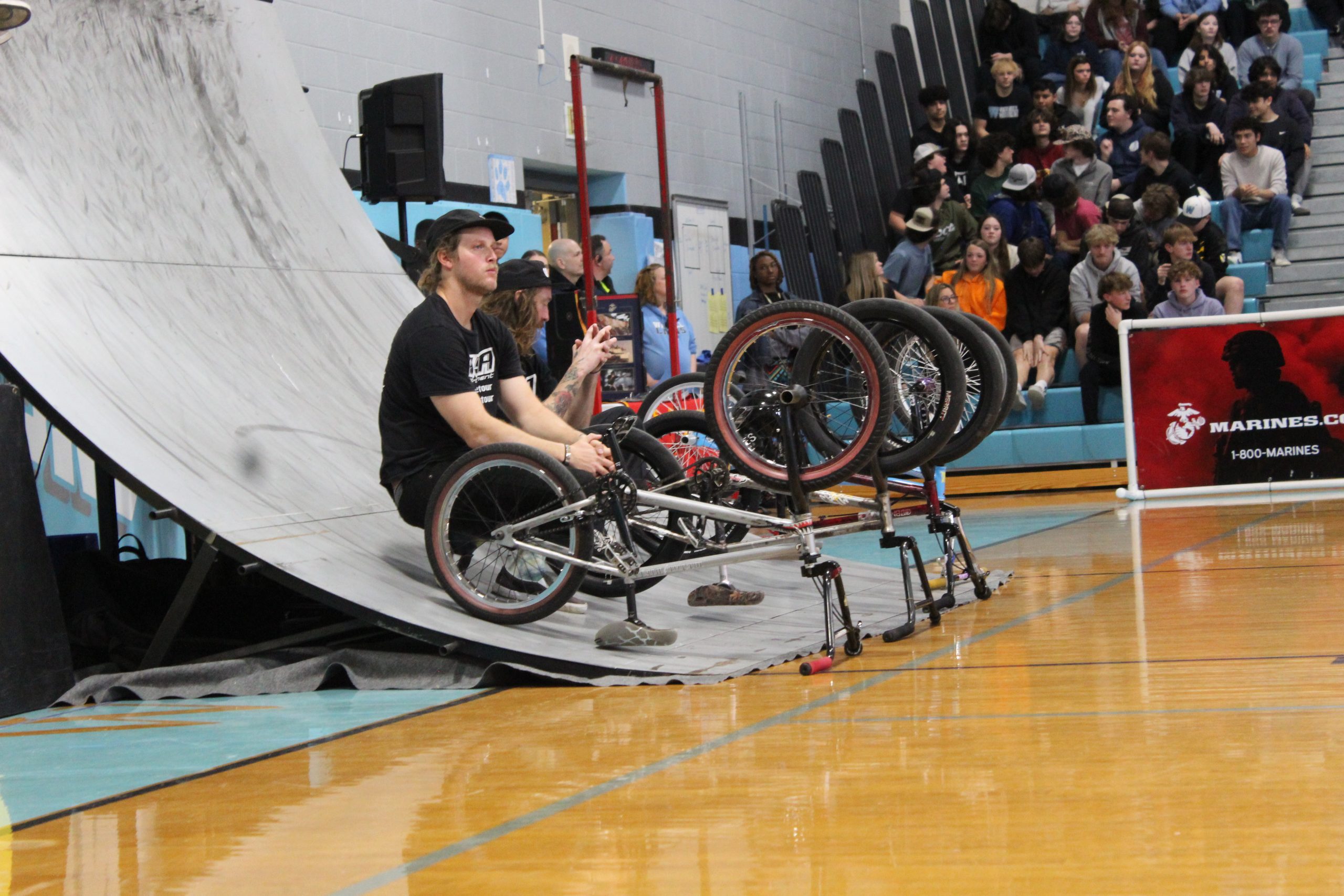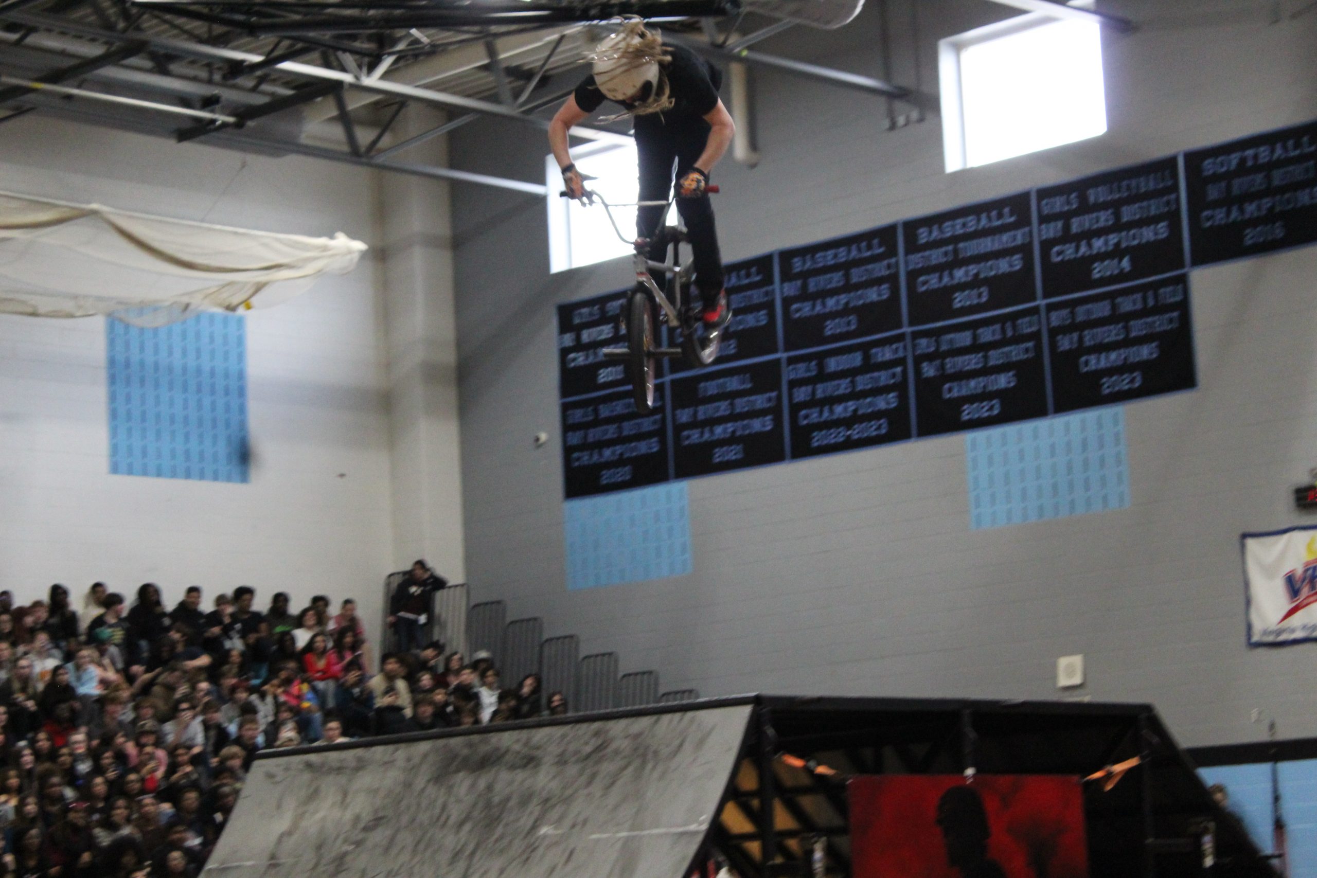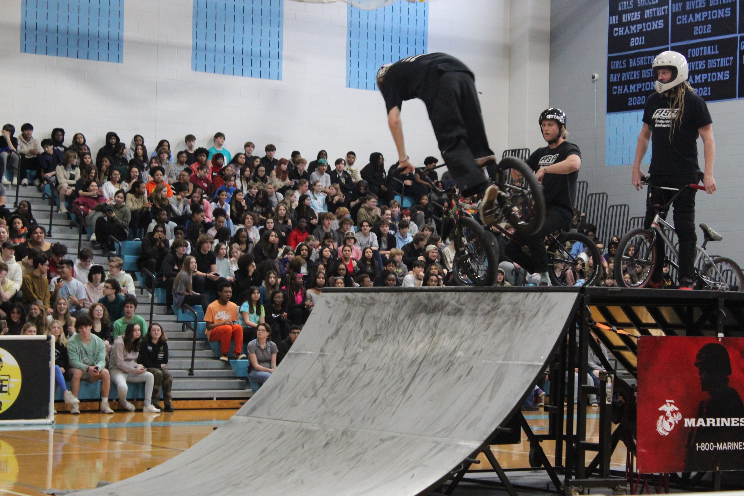 On March 8, students and staff at Warhill High School spent most of their afternoon in the gym. Ramps were set up and a DJ pumped up the crowd. Zach Newman, Mason Ritter, Riley Jordan, and Trevor Meyer were zooming around on their bikes, showcasing massive tricks, all in support of the message of ending bullying.