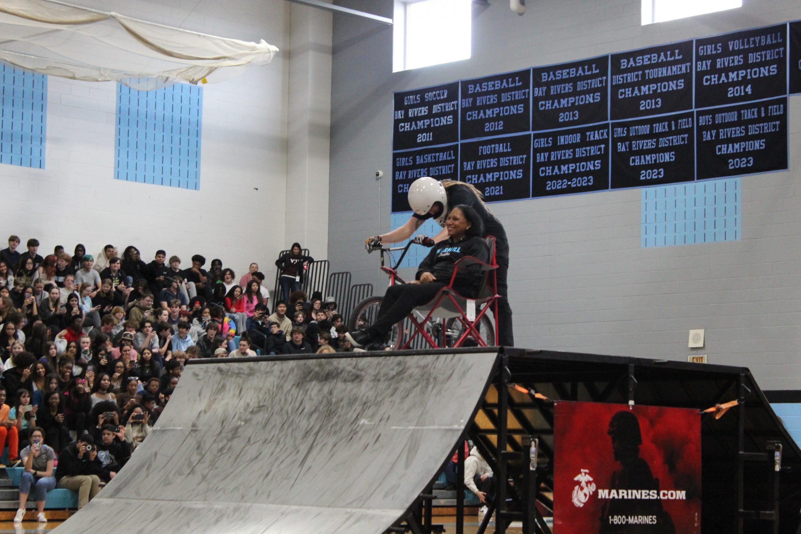 Assistant Principal Mia Pollard got in on the action, as she was selected to sit on a chair on top of a ramp while one of the bikers jumped over her head.