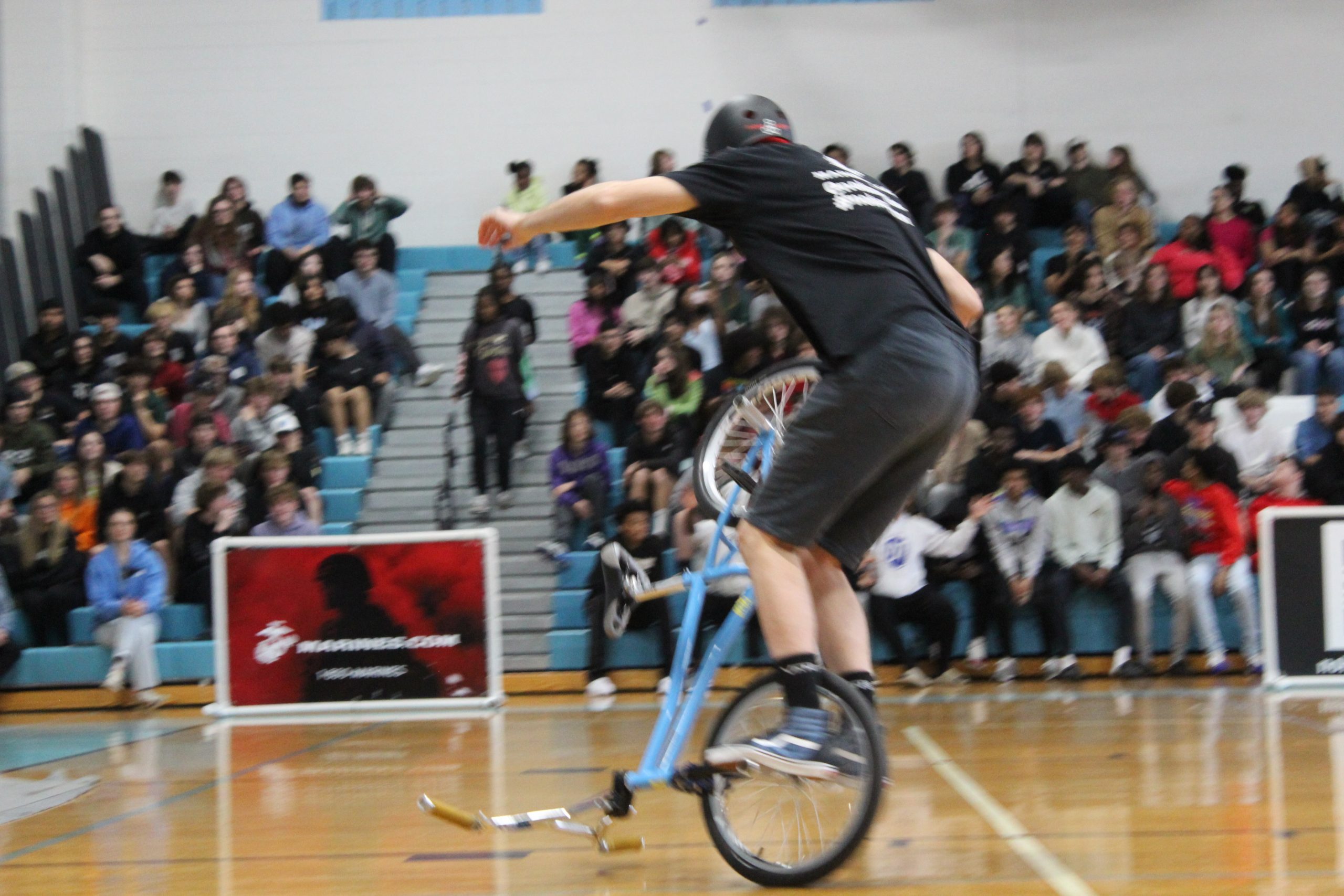 All the riders performing throughout the assembly share their experiences with bullying during the show. Highlighted at Warhill was Zach Newman, who was picked on and teased for his girl’s bike when he first started biking. The bullying got to a point that he almost quit riding completely.