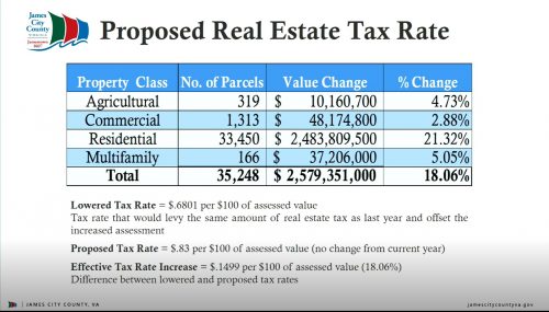 Highlights of this presentation state that the real estate tax rate will remain the same and include funding investments in county staff retention and compensation in addition to an increase of 4.5% to support Williamsburg-James City County (WJCC) teacher and staff pay raises.