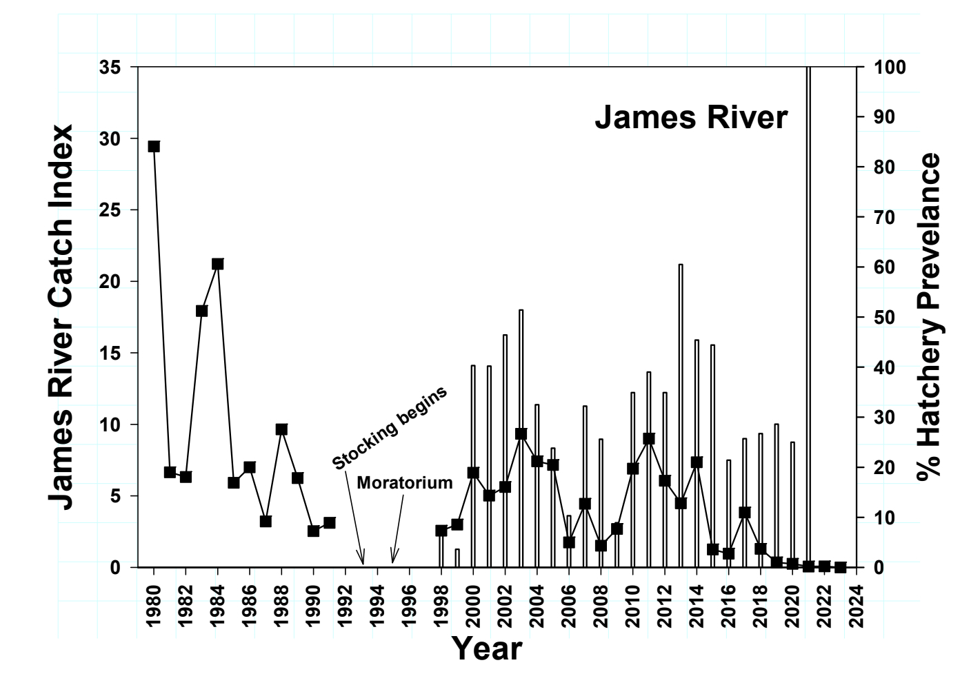 American shad and river herring populations are nowhere near what they were historically in Virginia. A moratorium on fishing for American shad in 1994 and the stocking of over 100 million American shad fry in the James River has not reversed a downward trend for the species.