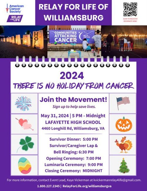 The Relay for Life of Williamsburg is happening May 31 at Lafayette High School. The annual fundraiser supports the American Cancer Society (ACS) and promotes cancer research while aiding cancer patients and survivors. Kaye Vickerman, Relay For Life Event Chair, and Mary Beth Taylor, Sr. Development Manager for the ACS, spoke with the Tide about the Relay for Life, and shared the event’s schedule, the most powerful moments during the evening, and how community residents can get involved. Listen here: