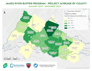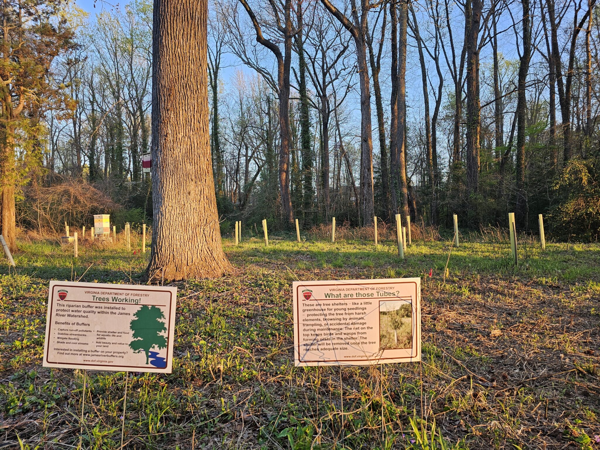 The Virginia Department of Forestry has a program to help install tree buffers on people’s properties, which has included a partnership with the Bay Foundation and the James River Association to install over 1,000 acres of trees planted along waterways in the Upper and Middle James River Watershed over the past five years.