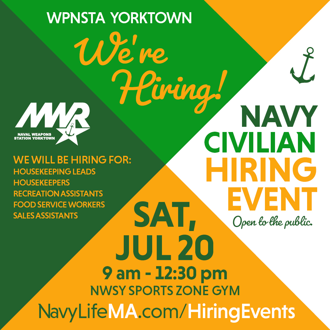 YORKTOWN — The team at Naval Weapons Station Yorktown’s Morale, Welfare & Recreation (MWR) Department will hold a civilian hiring event on Saturday, July 20 from 9 a.m. to 12:30 p.m.