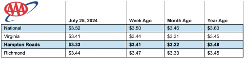 Locally, the gas price average for the Commonwealth decreased to $3.41 — three cents lower than a week ago and ten cents higher than a month ago. In Hampton Roads, prices decreased eight cents to $3.33, which is 11 cents higher than last month and 15 cents lower than a year ago.