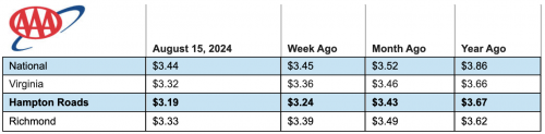 “Summer is wrapping up soon, and so far, gas prices have barely wobbled,” said Ryan Adcock, AAA Tidewater spokesperson. “But we still have a long way to go with hurricane season, so it’s too soon to declare that pump prices have started their usual Autumn swoon.”