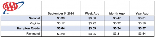 Locally, the gas price average for the Commonwealth decreased to $3.17. Thurday’s price is five cents lower than a week ago and 15 cents lower than a month ago. In Hampton Roads, prices decreased five cents to $3.04, which is 20 cents lower than last month and 53 cents lower than a year ago.