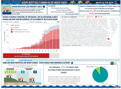 NRDC’s data shows that the number of repetitive loss properties continues to rise as storms grow more intense and more frequent in a warming world. They also illustrate the inadequacy of FEMA flood maps, which are updated infrequently and have relied on outdated data that looks back rather than forward at a hotter, wetter Virginia. But those maps continue to guide developers, engineers, banks, local land use officials, and homeowners when deciding where to build and finance a project.