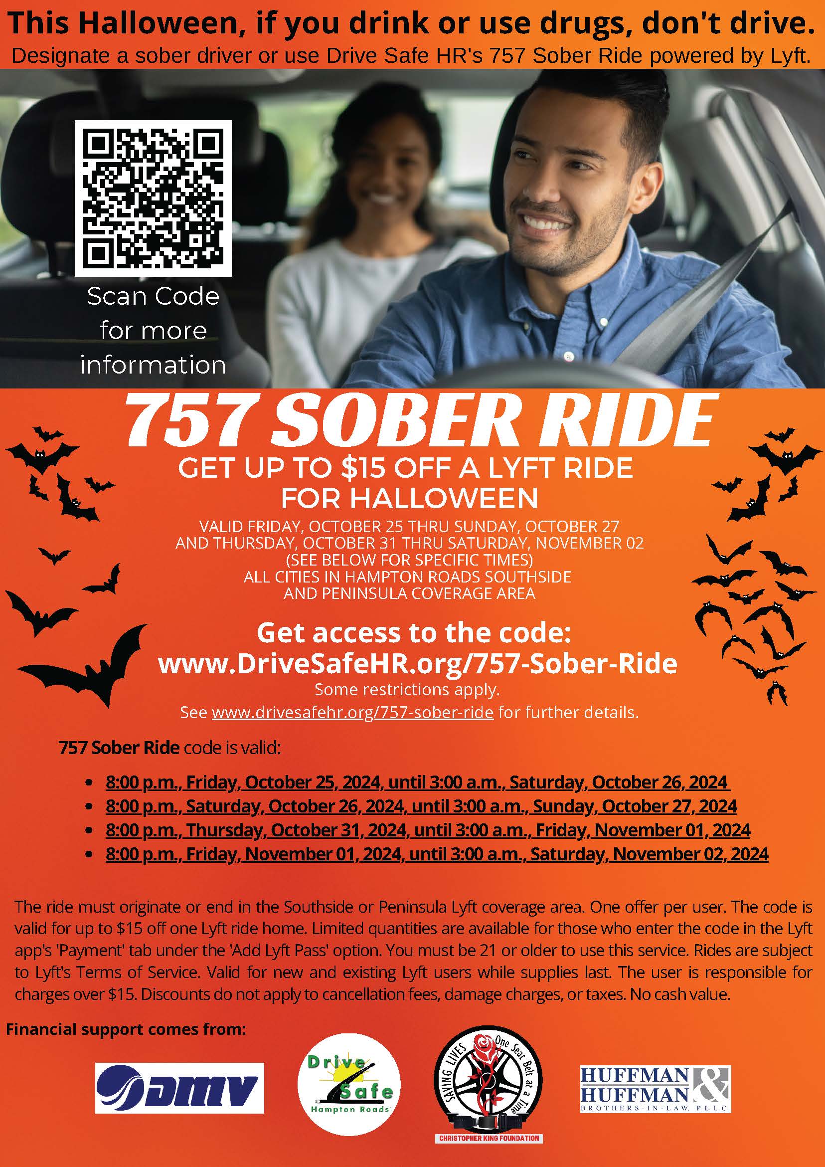 DSHR reminds those who plan on using alcohol, legal or illegal substances, to never operate a motor vehicle and never let a friend drive if they show signs of impairment. As an alternative this Halloween, Drive Safe HR’s offers 757 Sober Ride powered by Lyft — free or reduced fare rides for alcohol and drug-impaired drivers throughout Hampton Roads.