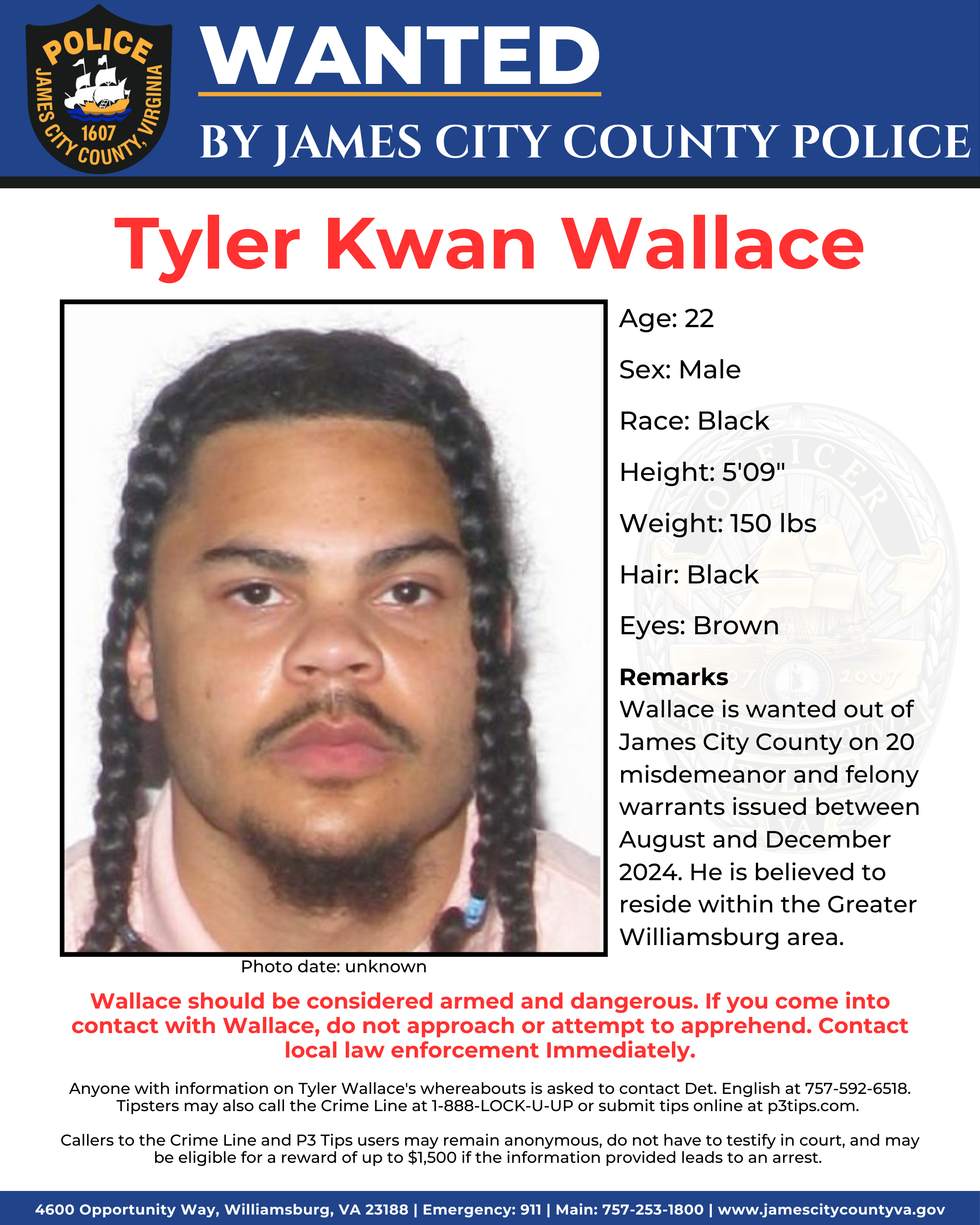 Wallace was wanted by the James City County Police Department for both misdemeanor and felony offenses, including Abduction, Assault and Battery Against a Family Member, Strangulation, Child Abuse and other violent crimes. The charges stem from incidents reported between August and December, and police said Wallace may be linked to additional offenses in the Hampton Roads Region.