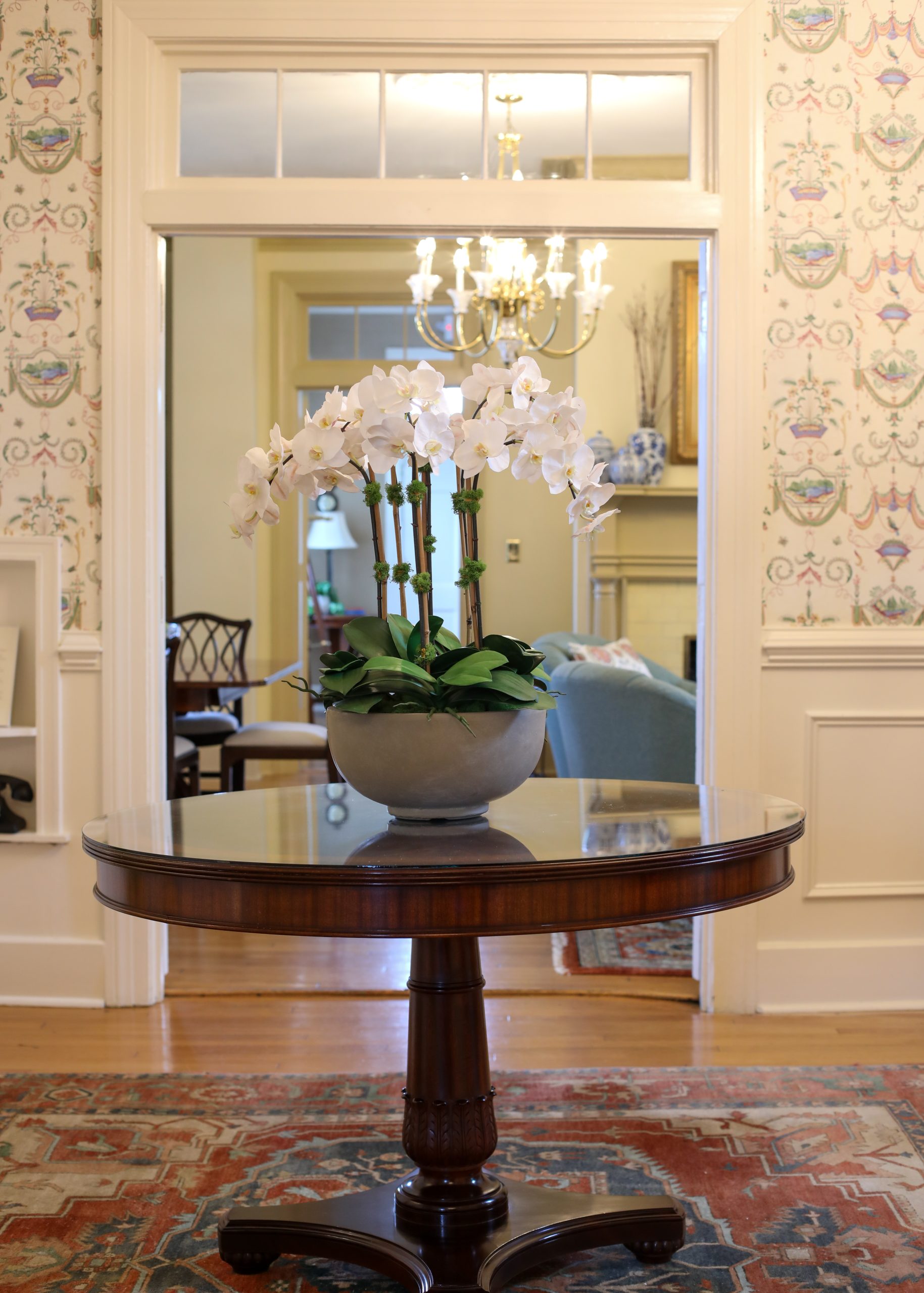 The spacious entry hall wallpapered in blue Chinoiserie sets the tone for the interior with its mix of traditional and transitional styles. Arched openings lead to either end of the house and straight ahead into the living room with the sunroom beyond.