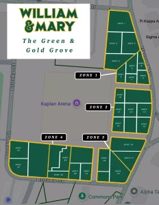To reserve your spot in the Green & Gold Grove, contact the Tribe Ticket Office at (757) 221-3340 or via email at tribetickets@wm.edu. The guidelines set for in the Game Day Parking Area Policy apply to all areas around Kaplan Arena and Zable Stadium on football game day.