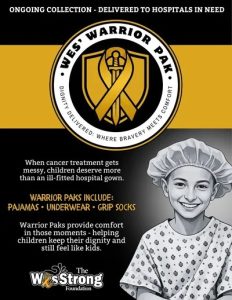 Krista, founder of the Wes Strong Foundation and mother of Wes, recently launched the Wes’ Warrior Packs initiative, which delivers clothing essentials to pediatric cancer patients in hospitals.