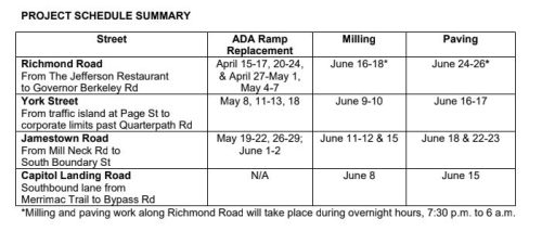 The City has hired Allan Myers and its subcontractor, 360 Services, to complete road improvements, including milling and paving streets and replacing Americans with Disabilities Act (ADA) ramps along Jamestown Road, York Street, and Richmond Road. The southbound travel lane on Capitol Landing Road will undergo milling and repaving to correct uneven pavement caused by a previous water main installation.