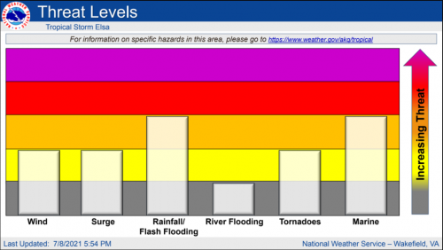 The chart below (courtesy of NWS Wakefield) shows the storm’s threat levels as of 6 p.m. on Thursday, July 8: