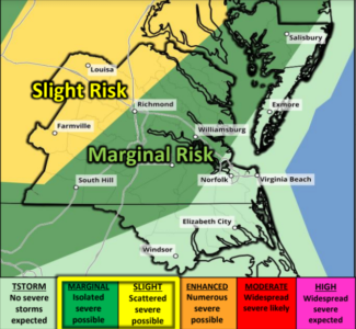 Between 3-10 p.m., central and eastern Virginia (including the Historic Triangle) up through lower Maryland could experience severe weather. This may include scattered to severe thunderstorms and localized, damaging wind gusts.