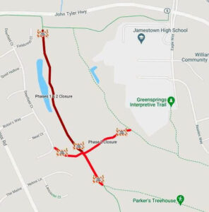 As a safety precaution, this portion of the trail will be closed to pedestrians and cyclists for the duration of the repairs. Trail users should utilize alternate routes along the Virginia Capital Trail, including a signed detour on the Greensprings Interpretive Trail (GST). During these closures, bicycles will be temporarily permitted on the detour portion of the GST; however, cyclists should be aware that some portions of the detour route are gravel rather than paved.