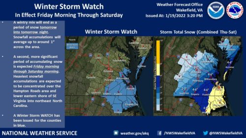 REGIONAL — The U.S. National Weather Service in Wakefield, Va. (NWS Wakefield) has issued a Winter Storm Watch for southeastern Virginia and northeastern North Carolina from Friday, Jan. 21 into Saturday morning, Jan. 22.