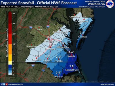 HAMPTON ROADS — The U.S. National Weather Service in Wakefield, Va. (NWS Wakefield) says that snow is expected to begin falling in southeastern Virginia and northeastern North Carolina on this afternoon (Friday, Jan. 21).