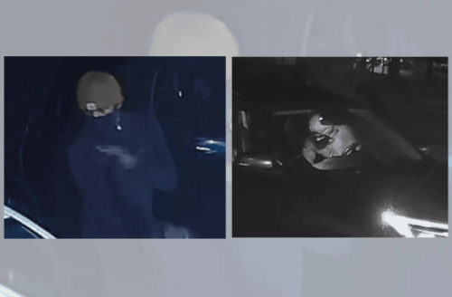 Two male suspects were captured on video surveillance entering unlocked vehicles: